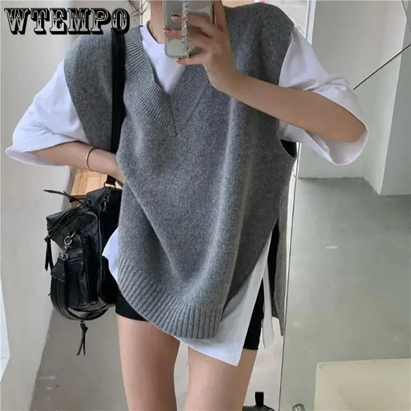 WTEMPO 회색 V넥 니트 조끼, 한국 인스타 패션, 루즈 캐주얼 스웨터 조끼, 사무실 여성 통근 풀오버 니트웨어, 신제품