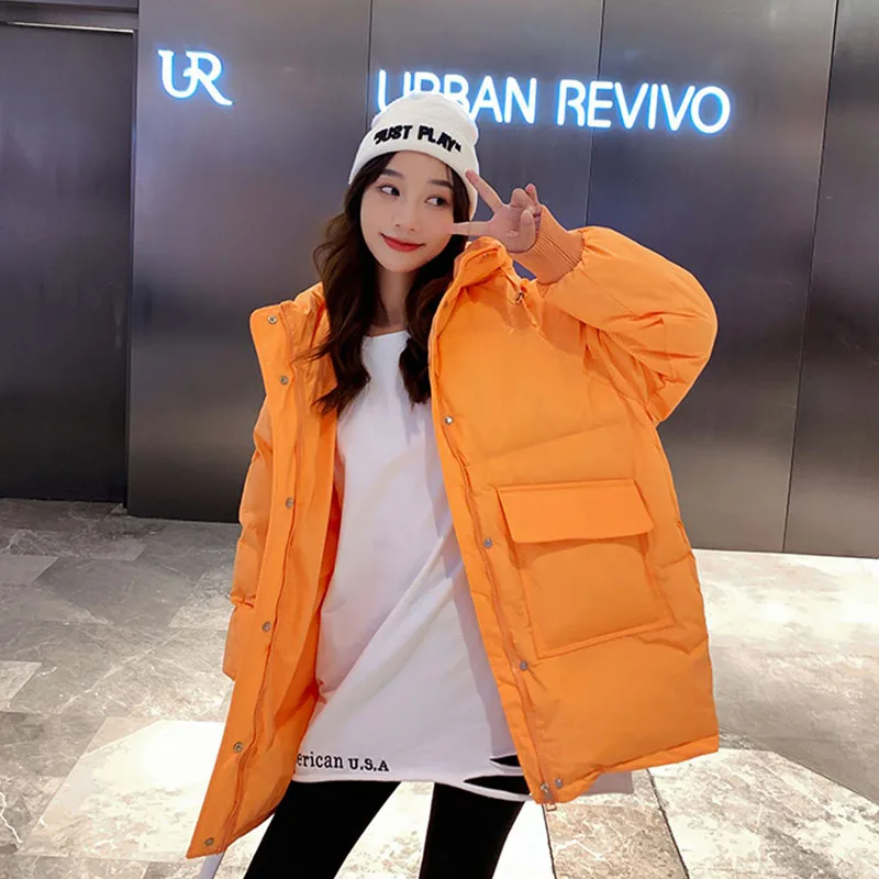 여성용 겨울 다운 코튼 코트, 중간 길이 파카, 두껍고 따뜻한 의류, 후드 재킷, 느슨한 오렌지 패딩 스노우 아우터