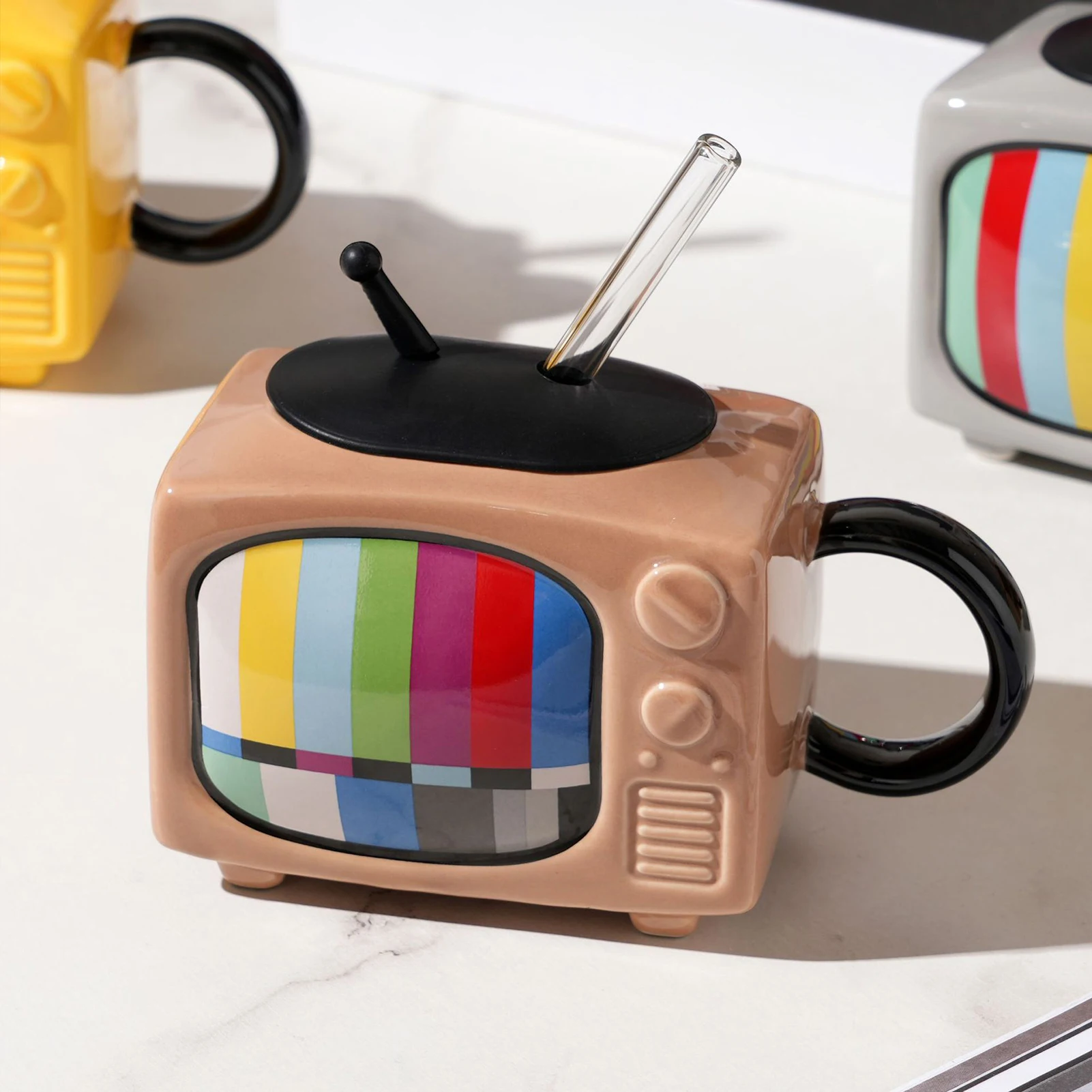 매혹적인 3D 텔레비전 티비 모양 우유 맥주 머그잔, 집용 컵과 커버 포함, 아름다운 마시는 음료 용기 세라믹 커피 머그잔, 고전적인