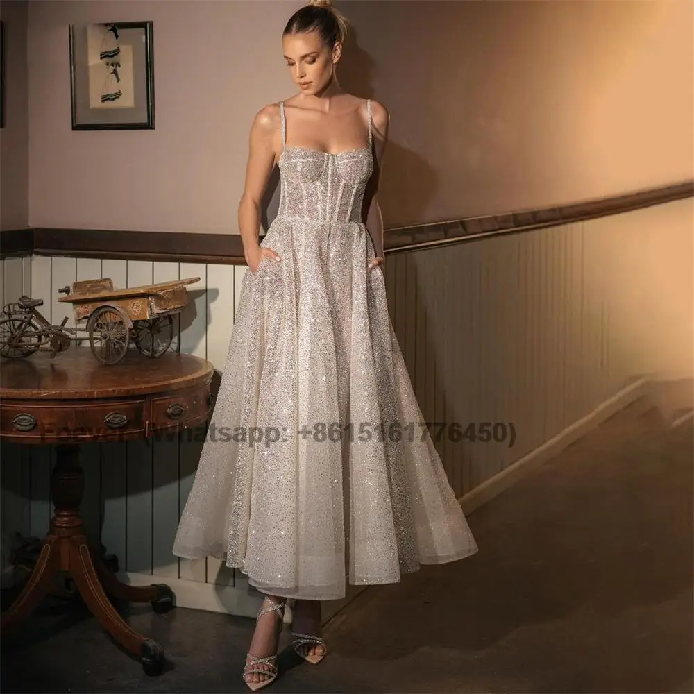 반짝이 A 라인 포멀 프롬 스파게티 스트랩, 반짝이는 연인 이브닝 가운, 스팽글, 발목 길이, 반짝이는 졸업 드레스
