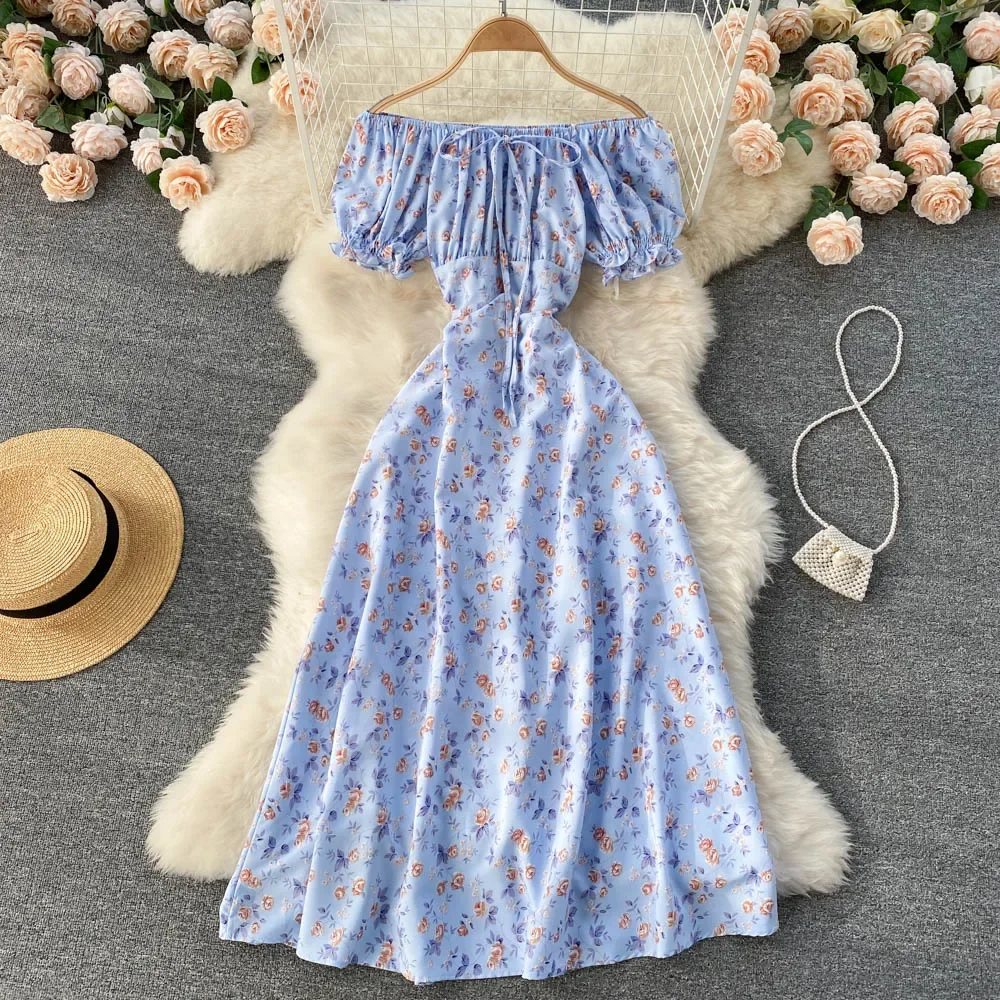 여성용 꽃 원피스 보헤미안 A 라인 슬래시 넥 반팔 원피스, 여름 빈티지 비치 오프 숄더 폴카 도트 선드레스