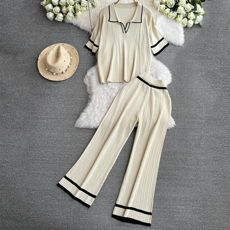 여성용 캐주얼 폴로 칼라 반팔 상의 및 하이 웨이스트 와이드 레그 팬츠, 루즈 배색 니트 투피스 세트, 여름 복장