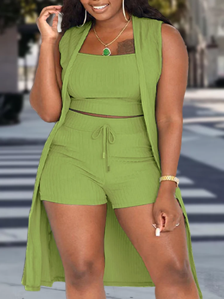 여성용 플러스 사이즈 캐주얼 의상 3종세트: 솔리드 골지 탱크 탑, 드로스트링 반바지, 스플릿 밑단 가디건