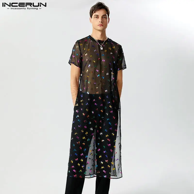 여성패턴지갑 INCERUN S-5XL 남성용 롱 스타일 티셔츠, 메쉬 투명 O-넥 반팔, 남성 티 탑, 스트리트웨어, 섹시 프린팅, 2023