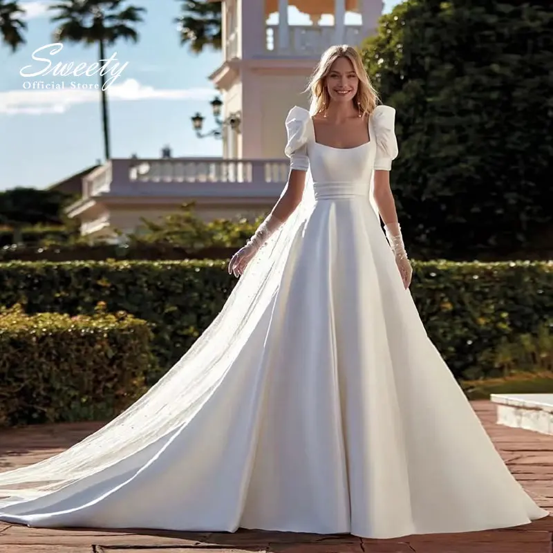 우아한 스퀘어 칼라 웨딩 원피스 실키 오간자, A 라인 바닥 길이 신부 가운, 퍼프 슬리브 단추, 반소매 맞춤 제작
