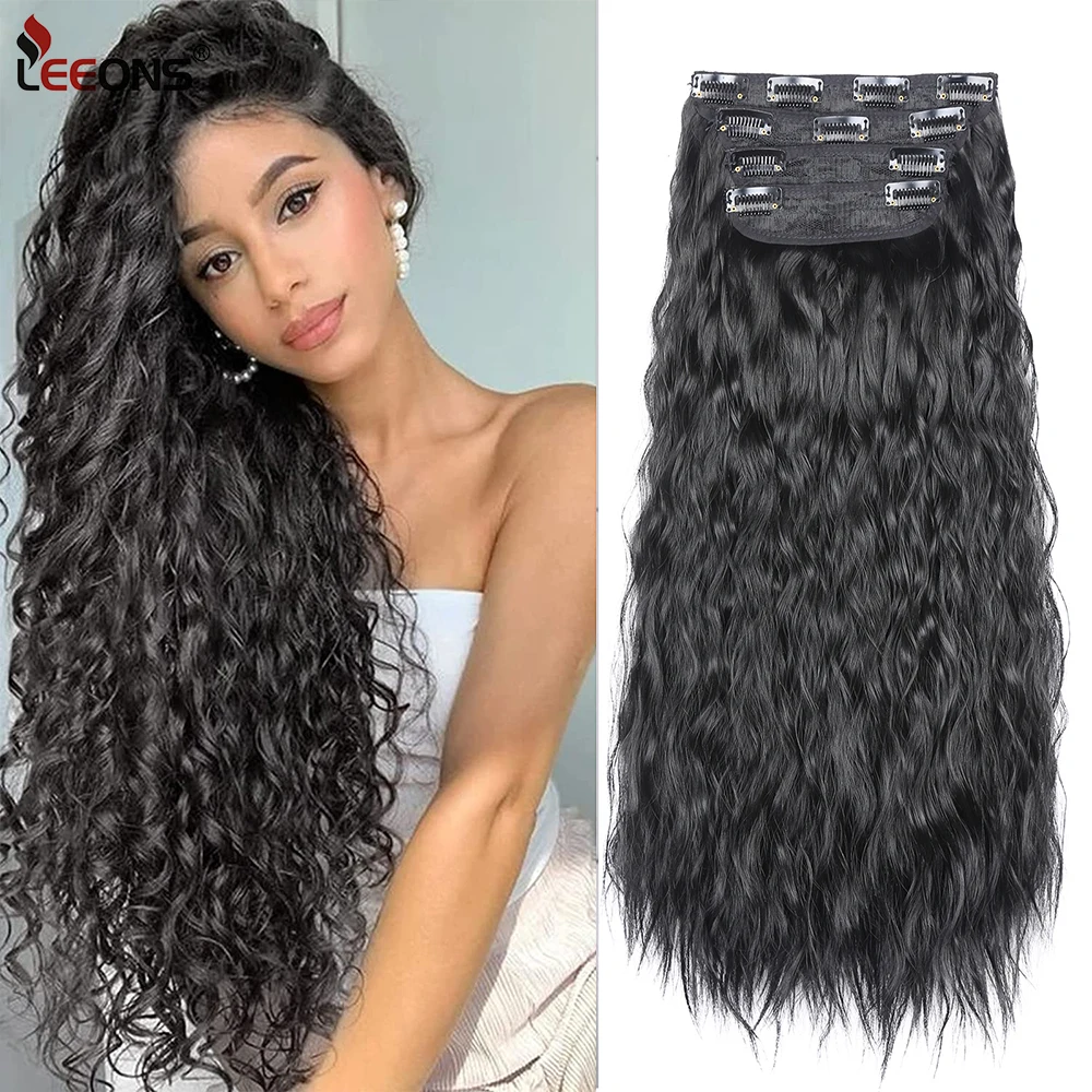 [한국어 제목] 여성용 두꺼운 컬 클립 인 헤어 익스텐션, 합성 긴 블랙 웨이브 클립, 헤어 헤어프리, 4개세트, 20인치