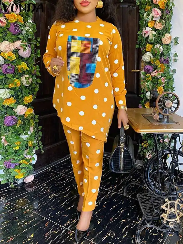 2024 가을, 플러스 사이즈 VONDA 여성용 보헤미안 프린트 바지 세트 – 폴카 도트, 긴 소매 상의, 캐주얼 루즈 스타일, 5XL, 2 개