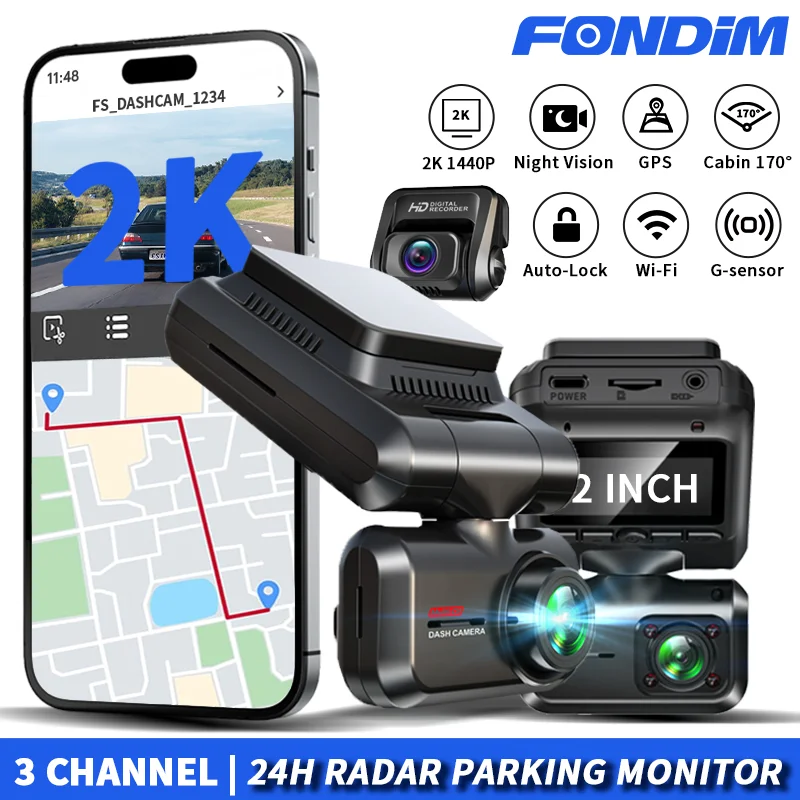 FONDIM 자동차 DVR GPS 대시 카메라, 3CH 자동차 DVR 4K 전면 및 1K 캐빈 캠, 후면 캠, 자동 비디오 녹음기 지지대, 24 시간 주차 모니터 (A7) |